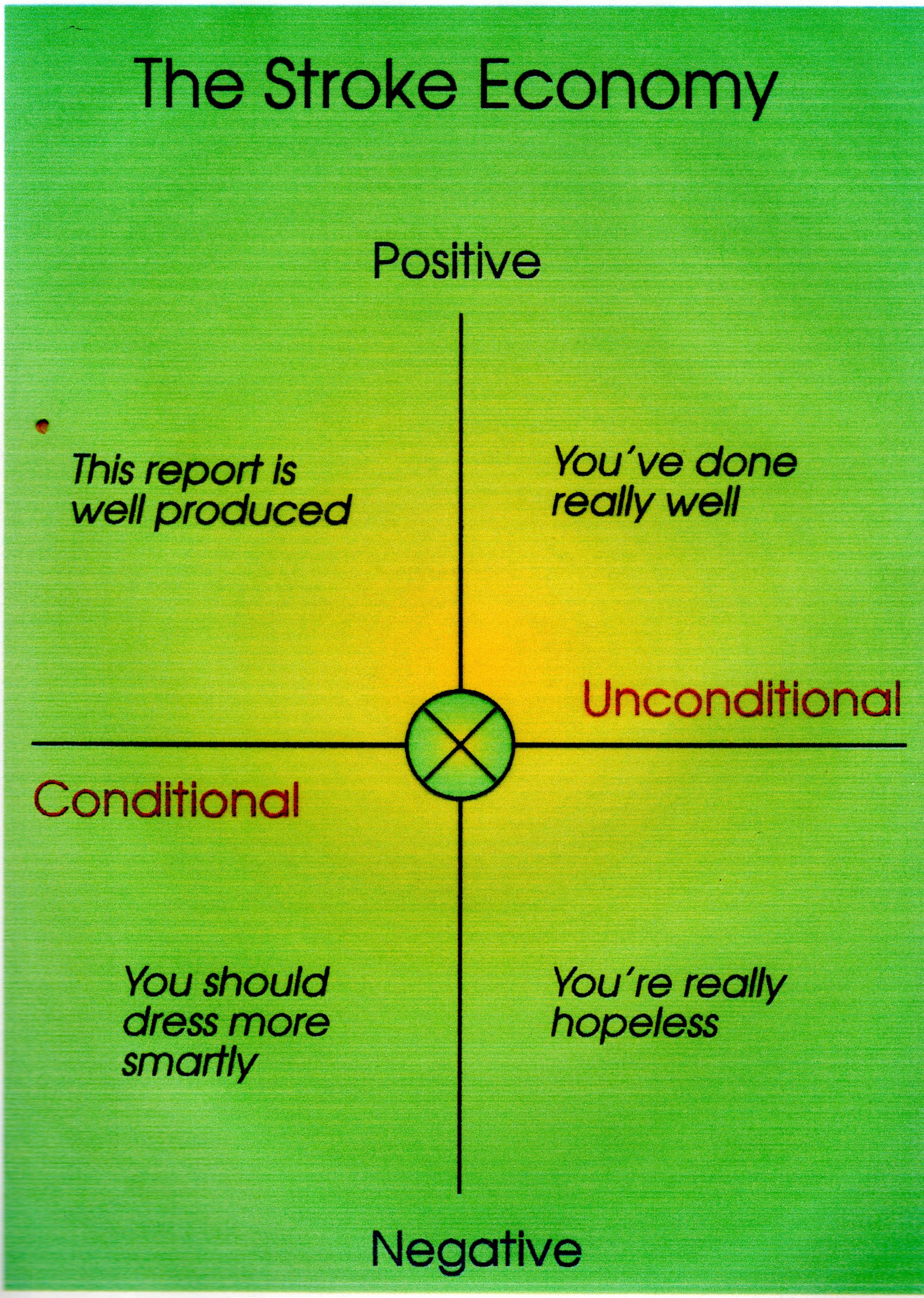 - ‘Stroking’: 25% positive and unconditional; 25% negative and conditional, etc.